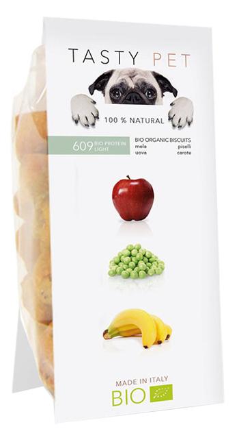 Biscotto 100% Naturale e Vegano per tutti i tipi di cane. Contiene zucchine,carote e piselli che hanno un basso indice glicemico e sono facilmente digeribili, ricche di fibre naturali, migliorano il funzionamento dell'intestino e aiutano ad eliminare le tossine, depurando l'organismo. Le analisi chimiche dei prodotti sono state effettuate dal Dipartimento di Scienze Mediche Veterinarie dell'Alma Mater Studiorum Università di Bologna.