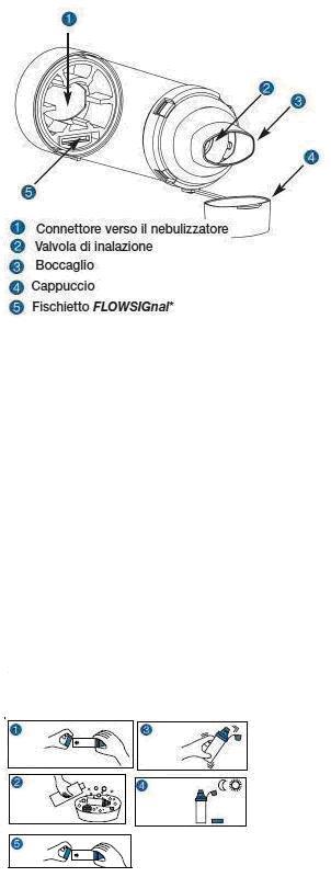 Prima dell'uso, assicurarsi che la camera di inalazione con valvola AeroChamber Plus* ("VHC") sia stata pulita secondo le istruzioni e che le informazioni fornite unitamente al nebulizzatore siano state lette. - rimuovere il cappuccio di protezione dal boccaglio sia dell'AeroChamber Plus* VHC che del nebulizzatore; - esaminare l'AeroChamber Plus* VHC per verificare che non vi sia nulla all'interno; - inserire il boccaglio del nebulizzatore nel connettore verso il nebulizzatore; - tenere saldamente in mano con il nebulizzatore. e agitarlo energicamente 4 o 5 volte. Accertarsi che il boccaglio del nebulizzatore all'interno dell'AeroChamber Plus* VHC sia orientato direttamente verso il boccaglio; - espirare normalmente. Inserire il boccaglio dell'AeroChamber Plus* VHC in bocca tra i denti anteriori e far aderire le labbra intorno al boccaglio. Tenere la lingua abbassata per non ostruire il boccaglio; - premere una volta sola il nebulizzatore iniziando a inalare lentamente e profondamente attraverso la bocca fino a completare l'inspirazione; se possibile, trattenere il respiro per 5-10 secondi. Il fischietto FLOWSIGnal* emette un sibilo quando il paziente inspira troppo velocemente; - attendere 30 secondi prima di ripetere le operazioni indicate nei punti 4-6, secondo quanto prescritto. Se il paziente non è in grado di eseguire la fase 6, può semplicemente inspirare ed espirare 2-3 volte (attraverso la bocca) per assumere il farmaco.