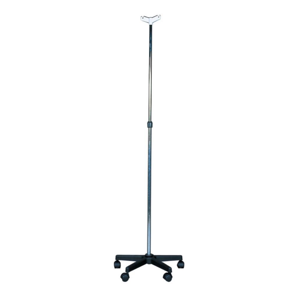 Dispositivo Medico CE, classe I.Asta porta-flebo con base in plastica nera a cinque razze su ruote piroettanti. Struttura in tubolare di acciaio cromato. Regolabile in altezza grazie all’apposita manopola.