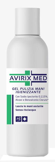 Avirix Med è un gel cosmetico per le mani che pulisce, igienizza e aiuta a preservare lo stato di pulizia delle mani ove non è possibile lavarle mediante le convenzionali prassi di detersione. Con sodio ipoclorito 0,115%, alcool e benzalconio cloruro (preservante). Lascia le mani asciutte. Senza risciacquo.