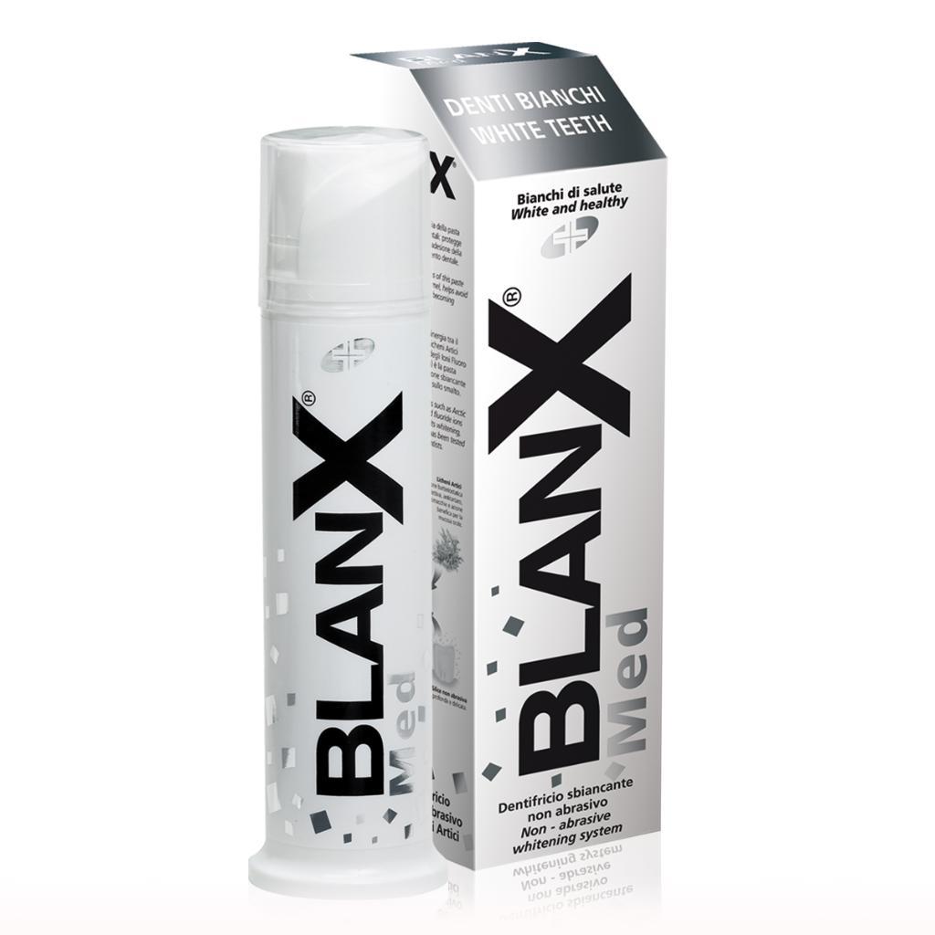 Dispositivo Medico CE. Pasta dentifricia con un'azione contro le discromie dentali: protegge l'integrità dello smalto evitando l'adesione della placca e contrastando l'ingiallimento dentale. Grazie alla particolare sinergia tra Licheni Artici e l'azione degli Ioni Fluoro, Blanx Med Denti Bianchi è una pasta dentifricia nota per avere un'azione remineralizzante e sbiancante senza azione abrasiva sullo smalto.Modalità d'uso
