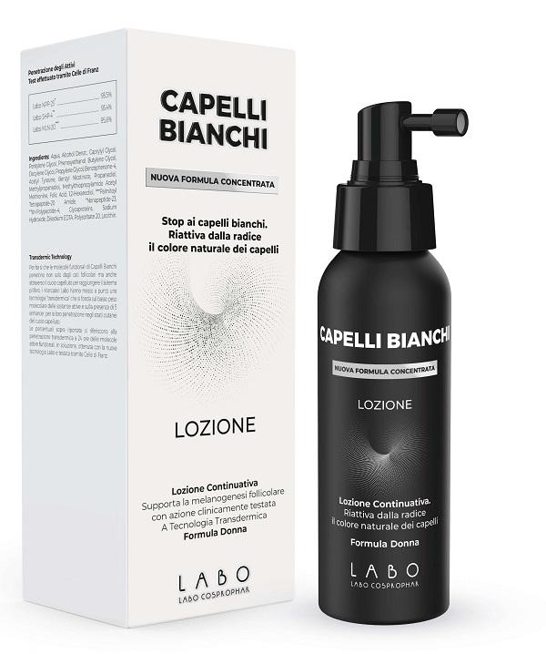 Capelli Bianchi lozione è un preparato spray ad uso topico di impiego cosmetico che favorisce la formazione della melanina capillare e aiuta a contrastare la diffusione dei capelli bianchi. Può essere utilizzato da solo o come applicazione continuativa dopo il trattamento intensivo Capelli Bianchi in fiale. L'invecchiamento cutaneo e numerosi fattori esterni fanno sì che la melanina naturale a poco a poco venga a mancare lasciando il capello depigmentato. I naturali processi di formazione della melanina possono essere favoriti dagli attivi a basso peso molecolare inseriti in concentrazione maggiorata nella nuova formula brevettata (brevetto svizzero CH 718 031): nonapeptide-23 (Labo NPP-23, peso molecolare 1,17 KDa), sh-polypeptide-4 (Labo SHP-4, peso molecolare 27,5 KDa) e palmitoyl tetrapeptide-20 Amide (Labo MLN-20, peso molecolare 0,88 KDa). Ad essi si associa il nuovo n-acetyl-l-tyrosine (NALT, peso molecolare 0,223 KDa) che, in quanto derivato della tirosina, agisce come precursore della melanina capillare. Completano la formula cinque enhancer cutanei che agiscono da facilitatori di assorbimento degli attivi (tecnologia transdermica brevetto svizzero CH 711 466). Nella formula donna sono presenti acido folico e glicoproteine. Il preparato contiene un leggero vasodilatatore. Non contiene sostanze coloranti. Formula Donna.