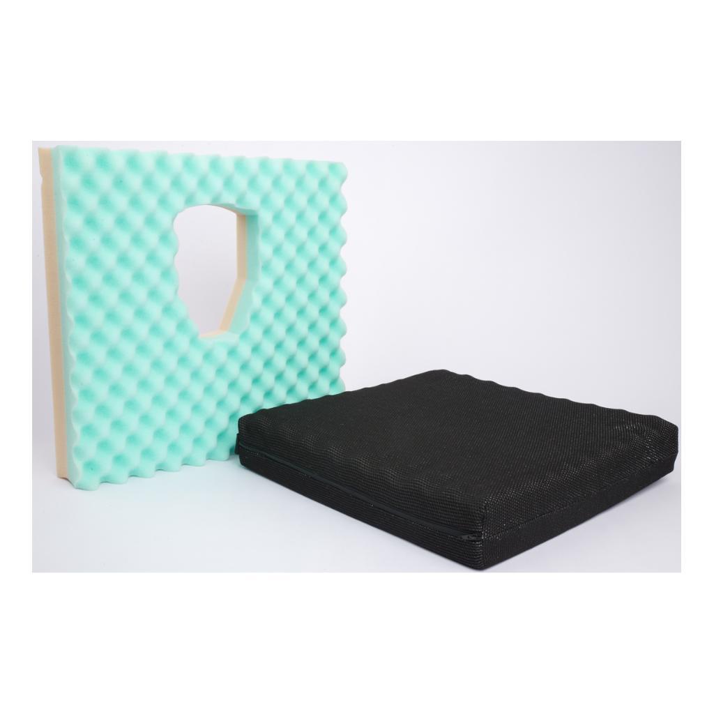Cuscino destinato ad essere utilizzato per alleviare il carico sulla zona perineale in pazienti di sesso femminile che soffrono di dolori post-parto, pazienti di sesso maschile che soffrono di ipertrofia prostatica e pazienti ambosessi che soffrono di emorroidi. Realizzato in due schiume poliuretaniche con diversa densità al fine di assicurare il giusto compromesso tra rigidità e comfort. La fodera è realizzata in tessuto elasticizzato di alta qualità lavabile in lavatrice.