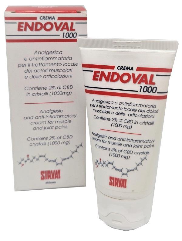 Crema analgesica e antinfiammatoria studiata per il trattamento locale dei dolori muscolari e delle articolazioni. È adatta ad un uso frequente e prolungato e grazie alla sua azione rapida ed efficace, trova impiego anche nell'attenuazione dei dolori legati al ciclo mestruale. Endoval 1.000 è formulata con principi attivi tutti naturali come arnica, mentolo, essenza di gaulteria, chiodi di garofano ess. e cristalli di cannabidiolo (CBD), ogni tubetto di crema da 50 g contiene 2% di CBD in cristalli (1.000 mg). Il cannabidiolo, ha proprietà analgesiche, antinfiammatorie e antiossidanti, dialoga con il sistema endocannabonoide dell'organismo per calmarlo, ridurre la trasmissione dei segnali dolorosi e riportato all'equilibrio naturale.