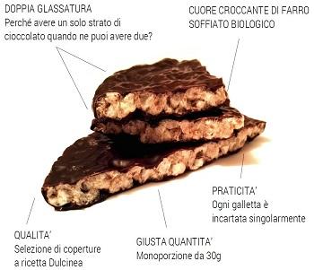 Galletta di farro ricoperta di cioccolato senza zucchero (edulcorato con maltitolo).È possibile inserire uno snack all’interno di un’alimentazione razionale e nutrizionalmente equilibrata, che quindi fornisca il giusto nutrimento quotidiano inteso sia come apporto calorico complessivo che come qualità e ripartizione dei singoli componenti sia macro che oligo.