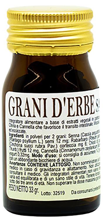 Polveri di: senna (Cassia angustifolia Vahl.) foglie, psillio (Plantago psyllium L.) semi; rabarbaro (Rheum palmatum L.) radice, china (Cinchona succi rubra Pav.) corteccia; chiodi di garofano (Eugenia caryophyllata Thunb.) frutti, cannella (Cinnamomum zeylanicum Blume) corteccia, polvere di yogurt.