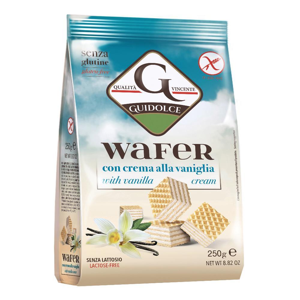 DescrizioneWafers farciti con crema alla vaniglia (crema 75%) senza glutine. 3 cialde di wafer con 2 strati di farcitura alla vaniglia. Il prodotto è formulato specificatamente per consumatori celiaci ed è privo di lattosio; non ci sono comunque prescrizioni al consumo da parte del consumatore non sensibile.