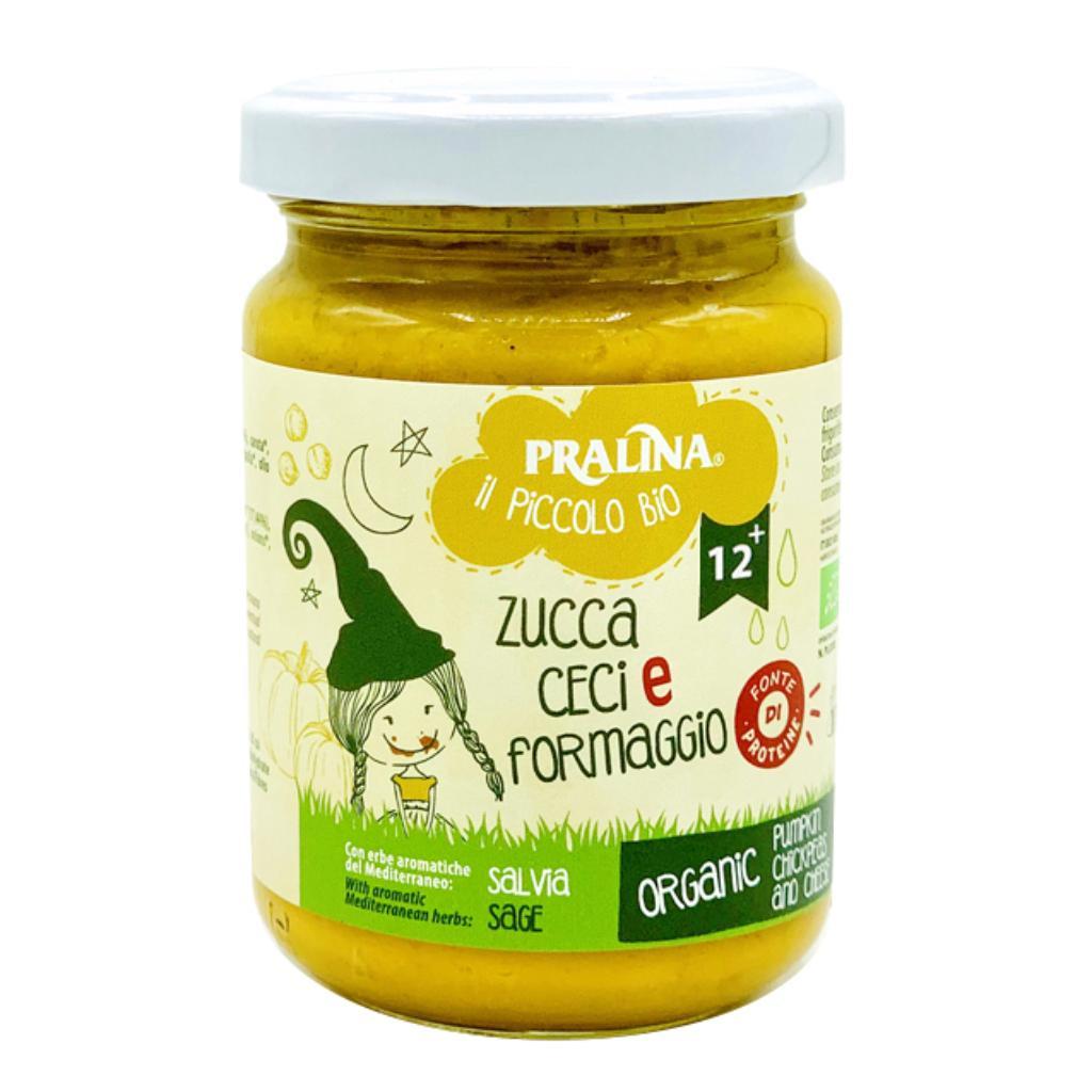 Zucca* (40,1%), acqua, ceci reidratati* (17,44%), carota*, formaggio* (6,79%) (latte*, sale, caglio microbico), cipolla*, olio extra vergine di oliva*, salvia*.
