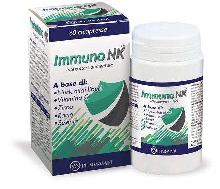 Integratore alimentare dosato in compresse, composto da ingredienti utili quando il loro apporto con la dieta è diminuito o assente. Nello specifico: vitamina C, zinco, rame e selenio supportano le difese immunitarie; la vitamina C inoltre aiuta la protezione delle cellule dallo stress ossidativo ed è utile nel contrastare stanchezza e affaticamento. La formula di Immuno NK è arricchita dalla miscela di nucleotidi liberi con titolazione minima al 40%.