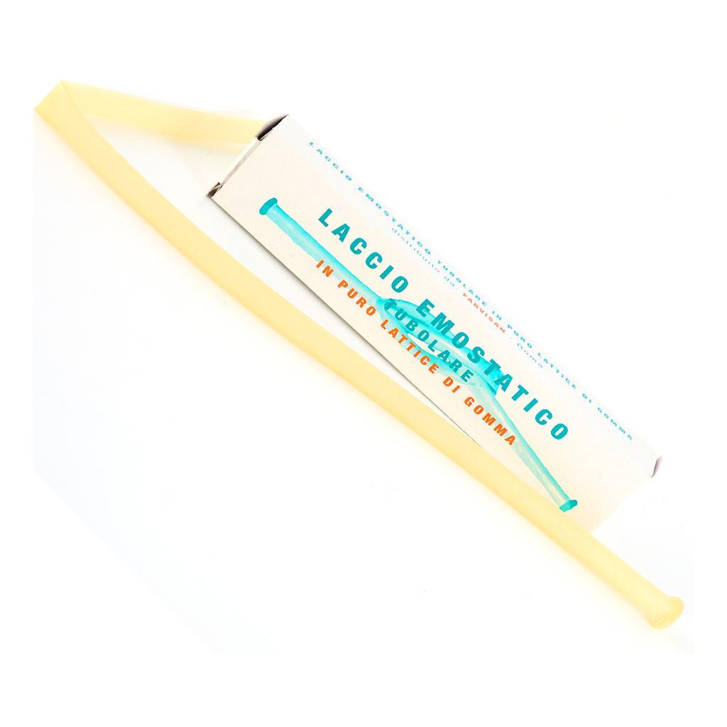 Lacci emostatici tubolari in lattice di gomma naturale, con bordino, atossici. I lacci emostatici in puro lattice di gomma vengono utilizzati come barriera meccanica per la compressione dei vasi sanguigni durante prelievi venosi o come barriera meccanica a monte delle ferite per fermare l'emorragia.