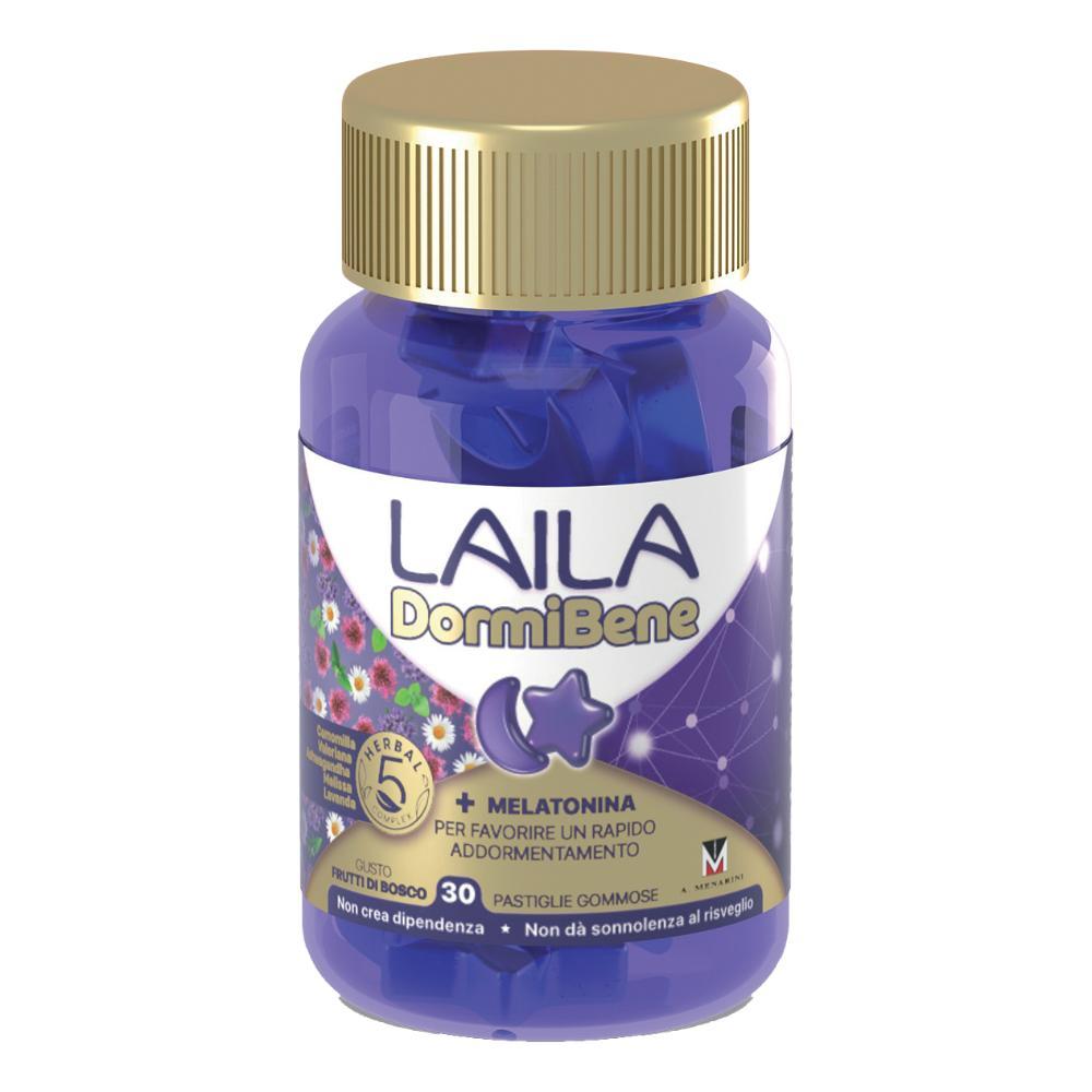 Laila DormiBene è un integratore alimentare a base di melatonina, camomilla, valeriana, ashwagandha, melissa e lavanda, formulato per favorire il rilassamento e migliorare la qualità del sonno.