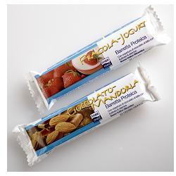Barretta proteica con marzapane e copertura di cioccolato al latte arricchita con vitamine.