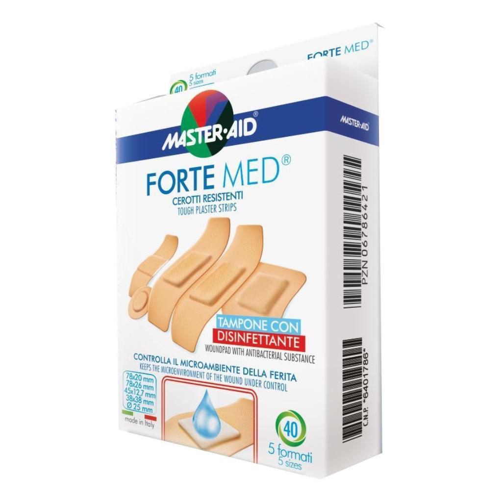 Dispositivo medico CE 0373. Cerotti in striscia a protezione elevata. Tampone con disinfettante (clorexidina digluconato). FORTE med offre una elevata protezione della ferita dagli agenti esterni (sporcizia, batteri) grazie ad un supporto particolarmente resistente. FORTE med grazie alla microperforazione consente la traspirazione della cute evitando processi di macerazione. L'adesivo ipoallergenico è particolarmente indicato anche per le pelli più sensibili.Caratteristiche tecniche