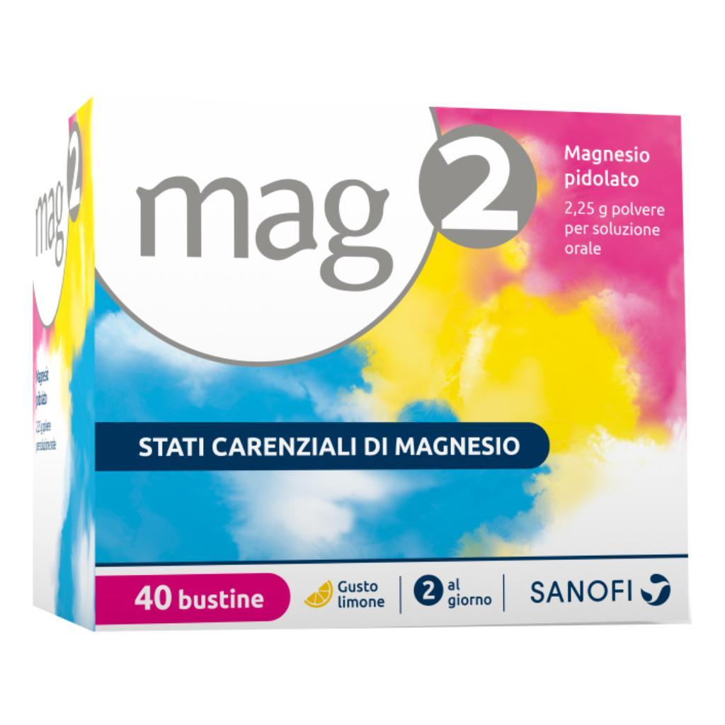 PosologiaPosologia Solo per adulti: 3 flaconcini o 3 bustine monodose di soluzione o 2 bustine di polvere al giorno. Popolazione pediatrica Nei bambini, la posologia potrà essere stabilita dal medico previamente consultato. Attenzione: usare solo per brevi periodi di trattamento. Istruzioni per l’uso MAG2 1,5 g/10 ml soluzione orale: È opportuno agitare prima dell’uso. Per aprire il flaconcino ruotare la parte superiore e staccarla. Assumere il contenuto del flaconcino tal quale o diluirlo in acqua. MAG2 2,25 g polvere per soluzione orale: Sciogliere il contenuto di una bustina in acqua.