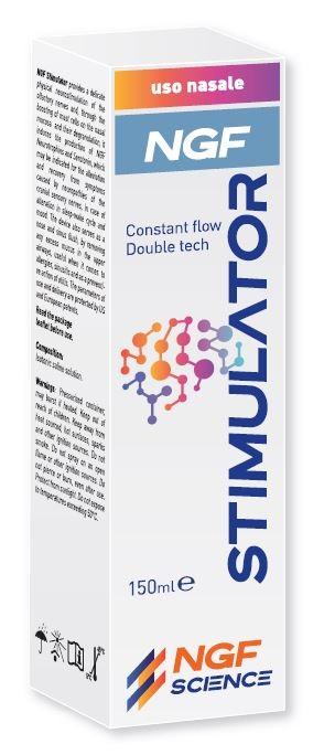 NGF Stimulator provvede a una delicata neuro-stimolazione fisica dei filamenti olfattivi e, attraverso il richiamo dei mastociti sulla mucosa nasale e alla loro degranulazione, all’induzione della produzione di neurotrofine NGF e Serotonina, che possono trovare indicazioni utili nell’attenuazione e recupero dei sintomi causati da neuropatie dei nervi sensoriali cranici e nei casi di alterazioni dei cicli sonno-veglia e dell’umore. Il dispositivo agisce anche come lavaggio del naso e dei seni paranasali eliminando l’eccesso di muco dalle vie aeree superiori, utile in caso di allergie, sinusiti e ad azione preventiva delle otiti. I parametri di uso e di erogazione sono protetti da brevetti Usa ed Europei.