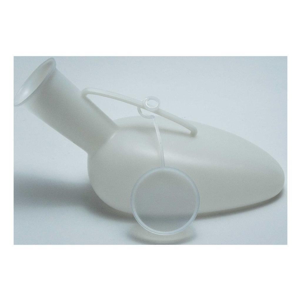 Urinale per uomo 1000 ml, graduato, in polietilene neutro con tappo agganciato. Confezionato singolarmente in sacchettino.