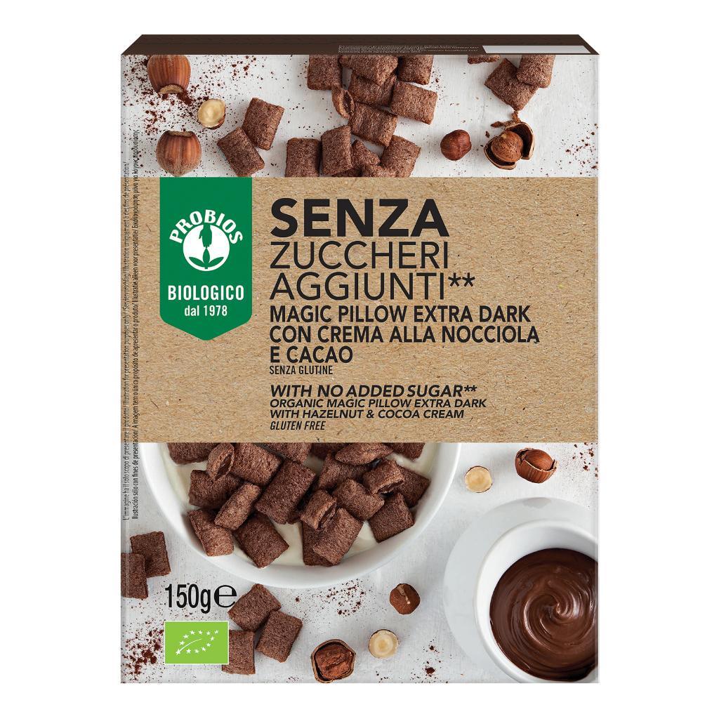 I Magic Pillow Extra Dark senza zuccheri aggiunti sono golosi e croccanti cuscinetti al cacao ripieni di deliziosa crema alla nocciola e cacao. Garantiti senza glutine e biologici sono dolcificati con eritritolo, sono perfetti per una colazione sfiziosa dal basso contenuto di zuccheri.