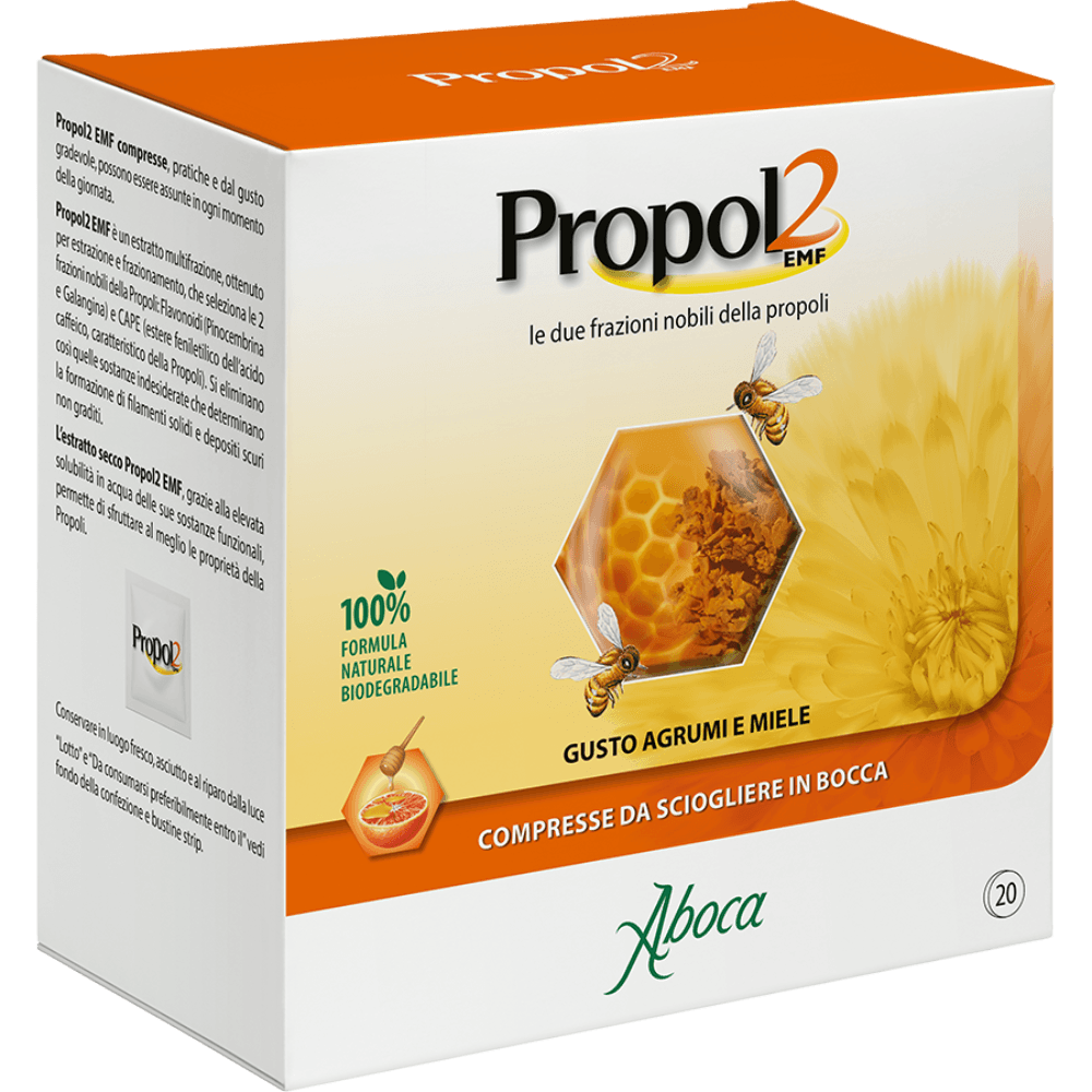 Propol2 EMF è unstratto multifrazione, ottenuto per estrazione e frazionamento, che seleziona le due frazioni nobili della propoli: flavonoidi (pinocembrina e galangina) e CAPE (estere feniletilico dell'acido caffeico, caratteristico della propoli). L'estratto secco di Propol2 EMF, grazie all'elevata solubilità in acqua delle sue sostanze funzionali, permette di sfruttare al meglio le proprietà della propoli.