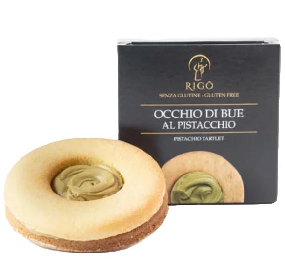 Dolce occhi di bue all’albicocca senza glutine. Pasta frolla formata a mano dal pasticcere con una deliziosa confettura al pistacchio.