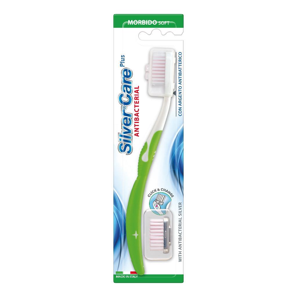 a contatto con l'acqua l'argento della testina sprigiona ioni attivi che abbattono la carica batterica che resta invece sui normali spazzolini. Test microbiologici hanno valutato il grado di contaminazione microbica dopo l'utilizzo quotidiano mettendo a confronto lo spazzolino Silver Care con uno di tipo tradizionale.