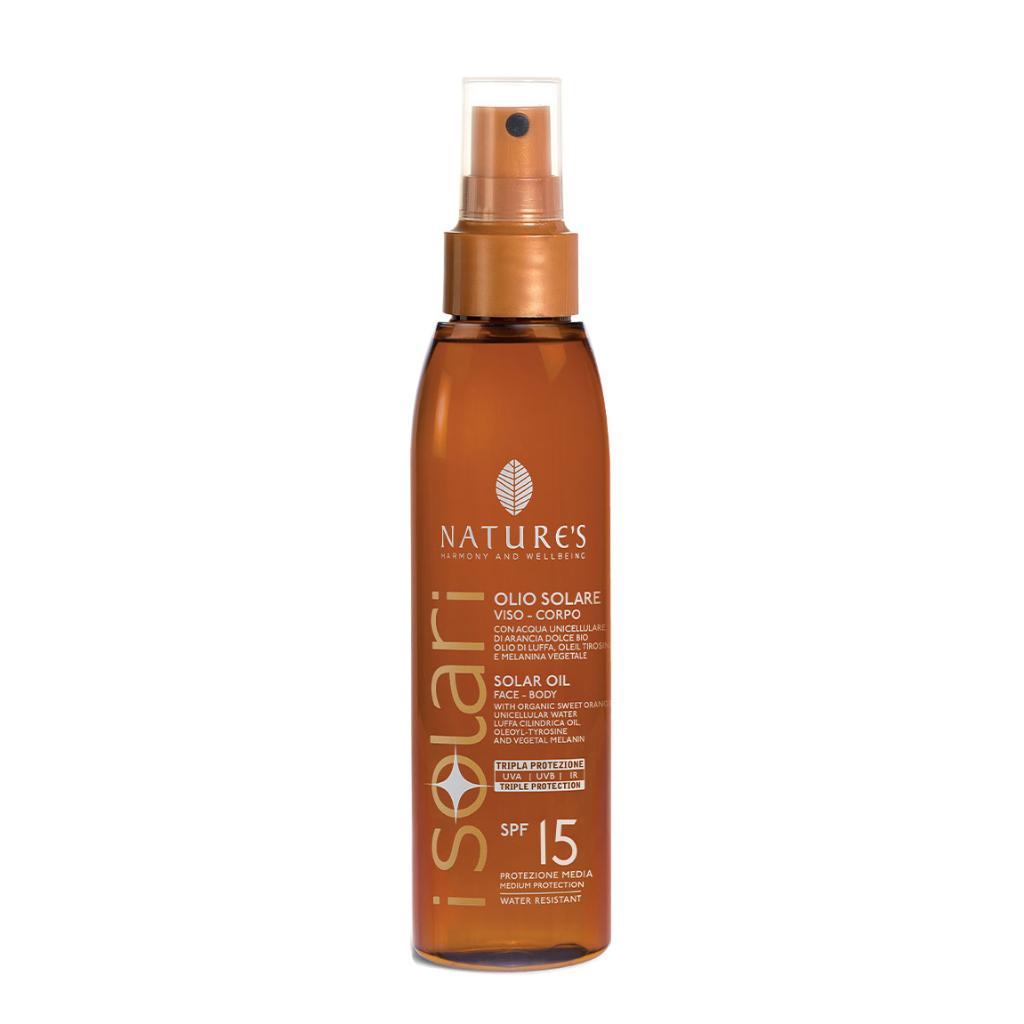 Pensato per chi desidera un colore intenso in tempi rapidi, l’Olio Solare Viso-Corpo iSolari protegge la pelle favorendo un’abbronzatura luminosa e duratura. La texture leggera, trasparente e a rapido assorbimento si fissa perfettamente sulla pelle, resistendo all’acqua e al sudore. La sua formula, a base di attivi naturali, contiene Acqua Unicellulare di Arancia dolce bio, ad azione antiossidante, olio di Luffa, Oleil Tirosina e Melanina vegetale, che potenzia l’azione della melanina naturale assicurando un’abbronzatura uniforme e duratura. L’Olio Solare iSolari, grazie alla leggerezza della sua texture, è ideale anche per i capelli, li mantiene idratati e nutriti, proteggendoli dall’eccessiva esposizione al sole e della salsedine, aiutando a preservarne il colore. Il fattore di protezione medio SPF15 è adatto ai fototipi scuri o quando la pelle è già abbronzata.