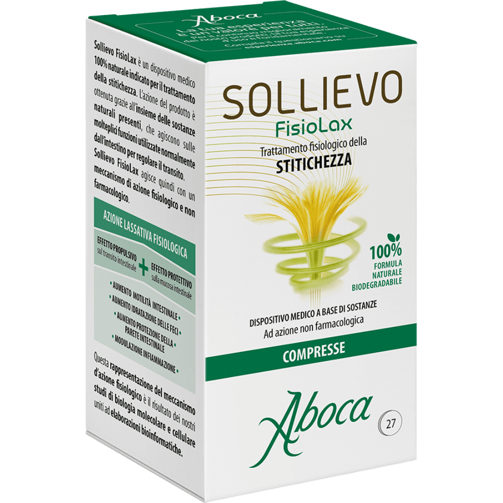 Sollievo FisioLax è un dispositivo medico 100% naturale indicato per il trattamento della stitichezza. L’azione del prodotto è ottenuta grazie all’insieme delle sostanze naturali presenti, che agiscono sulle molteplici funzioni utilizzate normalmente dall’intestino per regolare il transito. Sollievo FisioLax agisce quindi con un meccanismo di azione fisiologico e non farmacologico.