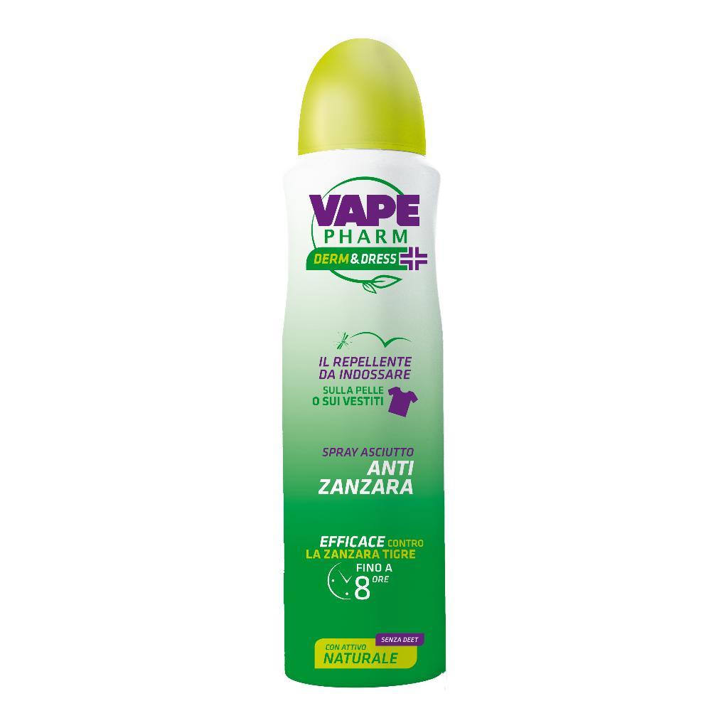 Vape Derm&Dress Spray è un innovativo repellente che può essere applicato sia sulla pelle che sui vestiti, per proteggersi dalle punture di zanzare e altri insetti alati. Questo pratico rimedio ha un effetto fino a 8 ore e il suo principio attivo di origine vegetale lo rende adatto alle pelli più sensibili. Lo spray non macchia né bagna i vestiti.